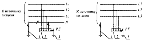 Рис. 2. Трёхфазные электрические системы переменного тока с изолированной и заземлённой нейтралью энергоисточника напряжением до 1 кВ