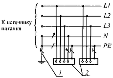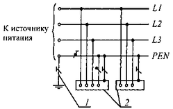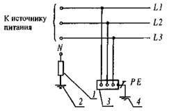 система TN-C-S – система TN, в которой функции нулевого защитного и нулевого рабочего проводников совмещены в одном проводнике в какой-то ее части, начиная от источника питания (рис. 2г);