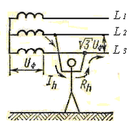 Rh – сопротивление человека; L1, L2, L3 – фазные проводники.