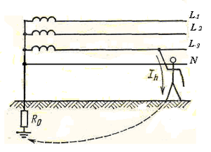В четырёхпроводной электрической сети переменного тока с глухозаземлённой нейтралью (система TN) ток, проходящий через человека, возвращается к источнику (электросети) не через изоляцию проводов, как в предыдущем случае, а через сопротивление заземления нейтрали (R0) источника тока (рис. 5). Сила тока, проходящего через тело человека, определяется при этом по формуле: