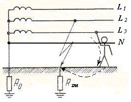 В аварийном режиме работы трёхфазной электрической сети переменного тока один из фазных проводов, например, электросети с заземлённой нейтралью (в системе TN) может быть замкнут на землю (при срабатывании системы защитного заземления, падении фазного провода на землю и т.п.) через сопротивление Rзм (рис. 6).