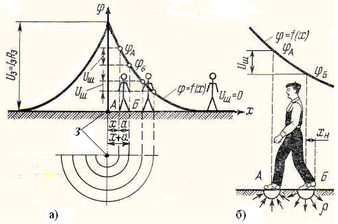 Uш – напряжение шага; а – ширина шага; φ – электрический потенциал; x – радиальное расстояние от точки замыкания на землю