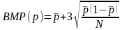 Межі регулювання для контрольної карти часток встановлюються на відстані 3-х середніх квадратичних відхилень процесу від центральної лінії визначаються як: