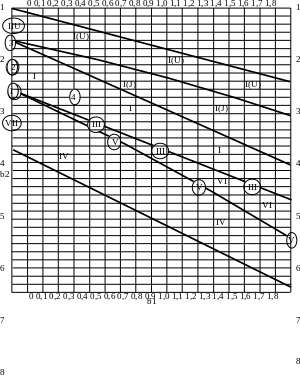 .на площині кривих Пірсона одержуємо точку, що найбільше близько лежить до точки відповідного закону розподілу. На рисунку 1, точка 1 - це нормальний закон розподілу, точка 2 - закон Сімпсона, точка 3 - закон рівної імовірності, точка 4 - закон Релея.