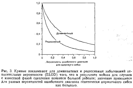 Обратным по отношению к проблеме неполной пенетрантности является вопрос о возможности ошибочной диагностики болезни у здоровых индивидов. В то время как неполная пенетрантность определяет неоднозначность генотипа здорового индивида и тем самым снижает его ценность в анализе сцепления, возможность неправильного диагноза означает, что и генотипы больных индивидов также должны рассматриваться как неоднозначные. Ошибочный диагноз маловероятен для таких явных заболеваний, как муковисцидоз, но представляет серьезную проблему при анализе психических нарушений. В диагностические критерии для этих заболеваний включено огромное количество поведенческих реакций, а наличие других больных в этой семье зачастую рассматривается как подтверждение диагноза. Используя рис. 3, можно оценить влияние данного уровня ошибок диагностики на анализ сцепления. Так как неправильная диагностика может серьезно отразиться на анализе сцепления, лучший выход из положения – приписывать всякому индивиду, диагноз которого сомнителен, «неизвестный фенотип». Только после обнаружения сцепления можно вернуться к таким индивидам и выяснить, унаследовали ли они генотип больного. Только таким путем можно узнать, являются ли неоднозначные симптомы проявлением исследуемого заболевания.