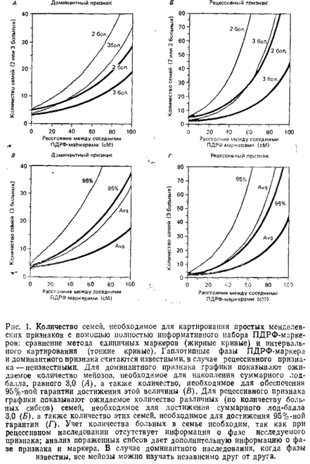 Для заболевания с простым типом наследования относительно легко построить карту сцепления. Рассчитав сумму ELOD-баллов, можно прямо оценить требуемую величину выборки. На рис. А, Б показано число ядерных семей с двумя или тремя пораженными, которое требуется, чтобы гарантировать 50%-ную вероятность успеха при картировании доминантного или рецессивного признака. Это число является функцией плотности расположения используемых ПДРФ-маркеров. Рисунок демонстрирует количество семей, необходимое 1) в случае, когда несколько маркеров рестрикционного полиморфизма используются по отдельности, и 2) если задействован весь потенциал карты ПДРФ, т.е. используются фланкирующие маркеры. Как следует из рис. 1, необходимое количество семей вполне эффективно при наличии геномной карты ПДРФ, отстоящих друг от друга на расстоянии 20–30 см.