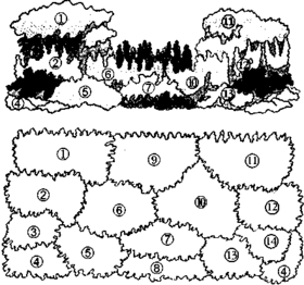 Составление плана является одним из основных пунктов работы при устройстве рабатки. Границы рабатки отмечают на плане с учетом выбранного масштаба. Полученная площадь дробится на квадраты, в которые помещают группы растений. Сначала на план наносят деревья и кустарники, затем высокие и раннецветущие растения. Первые размещают в центре или на заднем плане композиции, вторые - по краям.