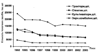 Аналіз цієї таблиці свідчить про те, що за останні роки виявляється чітка тенденція до зменшення наявності сільськогосподарської техніки. Так, кількість тракторів у 2003 р. склала лише 65% від рівня 1992 p., плугів - 54%, зернозбиральних комбайнів - 56%, кукурудзозбиральних - 36% та кормозбиральних - 33%.