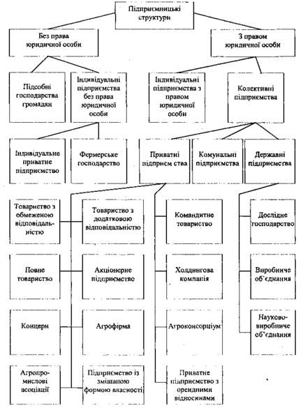 Виходячи з викладеного, можна відмітити, що підприємницькі структури поділяються на дві групи: підприємницькі структури без права юридичної особи та з правом юридичної особи. Існуюча структура підприємництва наведена на рис.2.1.
