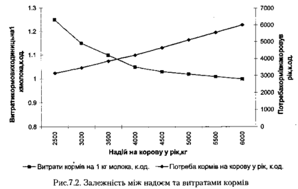 Встановлено, що збільшення продуктивності, наприклад у молочному тваринництві, супроводжується зростанням витрат кормів на голову тварин та їх зменшенням на одиницю продукції. Існуюча залежність ілюструється на рис. 7.2.