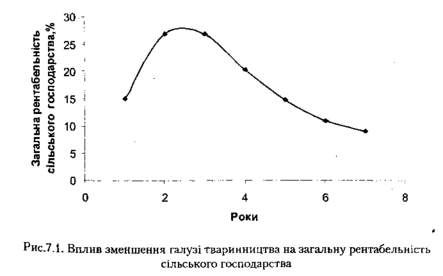 Так, скорочення поголів'я у перший рік, як показують дослідження існуючих тенденцій, безумовно веде до сплеску загальної ефективності підприємства за рахунок зменшення збитків від тваринництва. Цей сплеск буде тим більший, чим більша питома вага тваринницької галузі (рис.7.1).