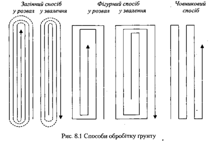 Способи виконання польових робіт. Польові тракторні роботи виконуються загінним, фігурним і човниковим способами (рис. 8.1).
