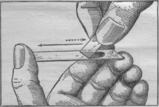 Приготовление мазка крови. Чистое предметное стекло держат, как показано на рисунке 1, между большим и средним пальцами левой руки. В правой руке, теми же или большим и указательным пальцами держат чистое покровное или тонкое шлифованное предметное стекло. По крайней мере, одно ребро таких стёкол должно быть уже ширины того предметного стекла, на котором приготовляют мазок. Обычно это достигается подбором или обламыванием углов шлифованного стекла.