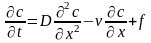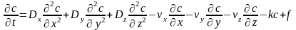 Тут c – концентація, t - час, x,y,z – координати (вісь x напрямлена вздовж потоку), Dx,Dy,Dz – коефіцієнти молекулярно-турбулентної дифузії, vx,vy,vz - складові швидкості потоку рідини, k – коефіцієнт самоочистки, f – функція подачі забруднення.