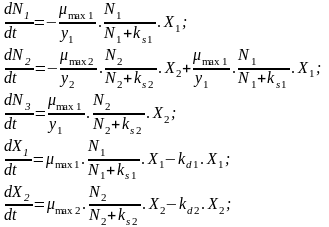 Тут X1, X2 – густина біомаси бактерій 1-го і 2-го виду; max1, max2 – максимальні швидкості росту бактерій; y1,y2 - коефіцієнти урожайності (збільшення біомаси бактерій за рахунок споживання одиниці субстрату); ks1,ks2 - константи напівнасичення (концентрація субстрату, при якій швидкість росту біомаси дорівнює половині максимальної); kd1,kd2 - коефіцієнти смертності.