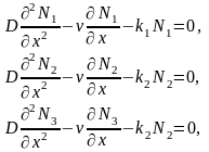 де D - коефіцієнт поздовжньої дисперсії, м2/с; v - швидкість потоку, м/с; N1, N2, N3 - концентрації азоту амонійного, нітритного і нітратного відповідно, г/м3; k1, k2 - коефіцієнти трансформації амонійної і нітритної форм азоту, 1/с.