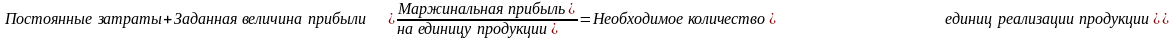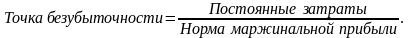 Так как в точке безубыточности прибыль равна нулю, эта точка будет найдена при условии равенства выручки и суммы переменных и постоянных затрат, т.е. необходимо найти такие параметры, которые удовлетворяли бы этому уравнению. Для того чтобы определить объем реализации, необходимый для получения заданной величины прибыли, нужно подставить в уравнение сумму прибыли. Если известна норма маржинальной прибыли, то точку безубыточности можно рассчитать по формуле:
