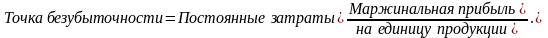 Объем продаж (реализации продукции), при котором организация покроет свои постоянные затраты за счет маржинальной прибыли, т.е. момент, когда организация не будет иметь ни прибыли, ни убытков, а каждая дополнительно проданная единица продукции будет приносить прибыль, называется точкой безубыточности (критической точкой, мертвой точкой, точкой равновесия).