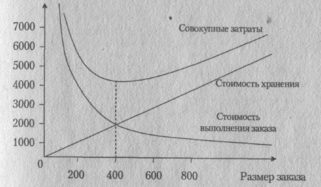 По графику видно, что если размер заказа растет, стоимость хранения тоже увеличивается. Стоимость выполнения заказа уменьшается по мере роста размеров закупаемых партий. Линия совокупных затрат находится в минимуме для заказа в 400 единиц и проходит через точку пересечения кривых стоимости выполнения заказа и стоимости хранения запасов. Следовательно, наиболее экономичен размер заказа в точке, где стоимость хранения равна стоимости выполнения заказа.