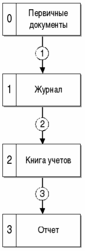 Согласно схеме, записи из первичных документов (запись 1) делаются в Журнал-Главную и параллельно - в регистры аналитического учета (блок 2). Скажем, в одной накладной отражено поступление десяти наименований различных товаров. В этом случае необходимо сделать как минимум одиннадцать записей: десять в десяти регистрах аналитического учета (раньше это были, как правило, карточки или отдельные страницы книги складского учета, именуемой обычно "амбарной") и одна запись - итоговая - делается в Журнал-Главной.
