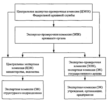 В крупных организациях с большим объемом документооборота (в министерствах и ведомствах, например) создается центральная экспертная комиссия (ЦЭК) и экспертные комиссии (ЭК) структурных подразделений. ЦЭК является совещательным органом, осуществляющим методическое руководство работой экспертных комиссий структурных подразделений, и работает в тесном контакте с ЭПК соответствующего государственного архива или архивного учреждения. Центральным органом, рассматривающим наиболее важные вопросы в осуществлении деятельности экспертных органов, рассматривающим и утверждающим нормативно-методические документы, является Центральная экспертная проверочная комиссия (ЦЭПК) Федеральной архивной службы.