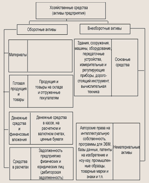 Состав хозяйственных средств предприятия определяется содержанием его деятельности. Но каждому предприятию для осуществления эффективной хозяйственной деятельности необходимы трудовые ресурсы, недвижимое имущество, оборудование, материалы, денежные средства и т.п. В бухгалтерском учете хозяйственные средства, которыми располагает предприятие, называют активами.