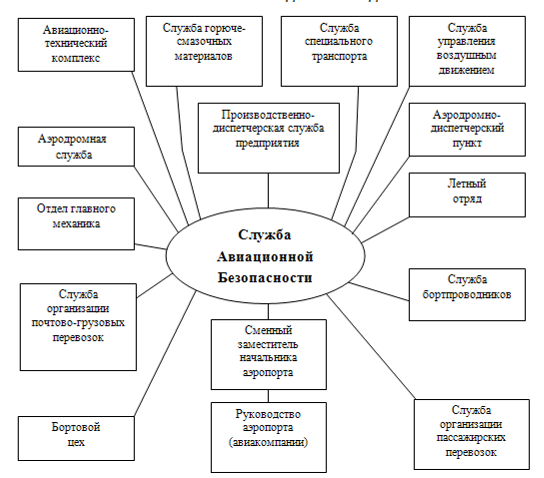 В вопросах обеспечения авиационной безопасности на воздушном транспорте службы АБ аэропортов взаимодействуют с различными правоохранительными, военными, пограничными, таможенными и другими органами власти. Функции, права и обязанности каждого участника системы обеспечения АБ гражданской авиации России определяется совместным межведомственным нормативным документом.