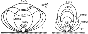 Діаграми направленості в горизонтальній площині показані на рис.11. З них випливає, що при роботі на відстані до 300 км антену можна вважати ненаправленою і немає необхідності її орієнтувати. При роботі на відстані, що перевищують 300 км, антену варто орієнтувати так, щоб напрямок на кореспондента був перпендикулярним до площини вібратора.