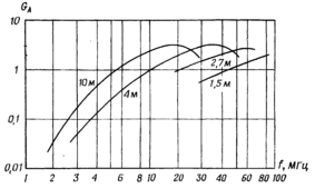 Усі приведені діаграми дозволяють судити про відносний коефіцієнт підсилення антени. Коефіцієнт підсилення антени в зеніт істотно змінюється у діапазоні: швидко росте з ростом частоти, досягає максимуму і потім знову падає. Хід залежностей коефіцієнта підсилення від частоти окремо показаний на рис.12.