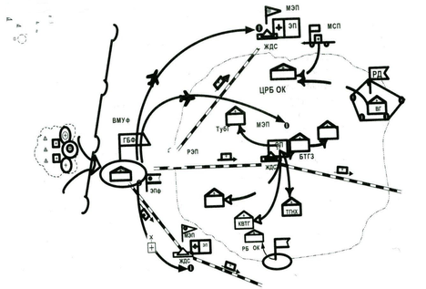 (Принципиальная схема эвакуации раненых и больных из ГБФ в ТГЗ приведена на рисунке).