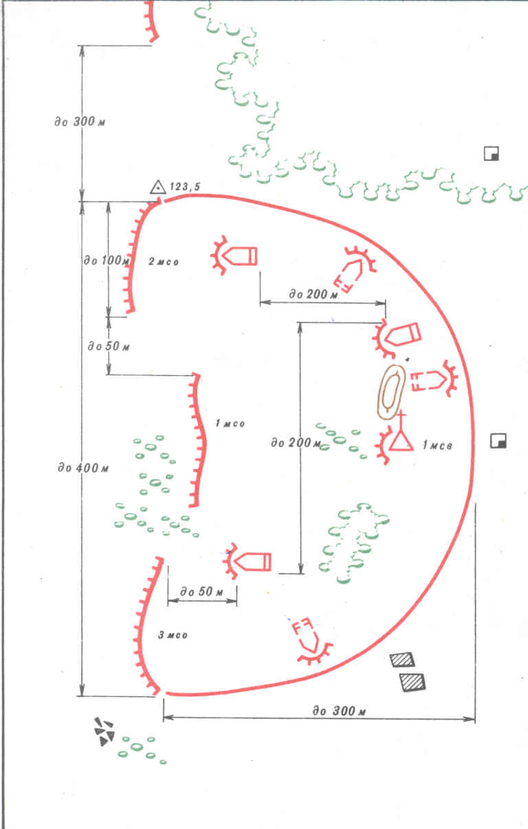 Взвод обороняет опорный пункт до 400 м. по фронту и до 300 м. в глубину.