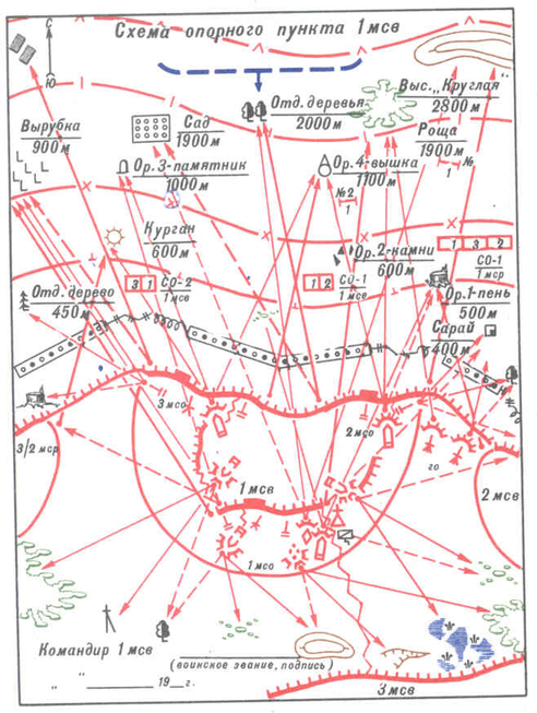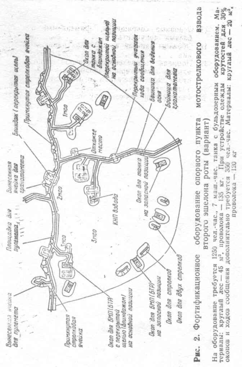 нженерное оборудование района обороны мотострелковой батальона (опорного пункта роты) начинается немедленно после определения позиций подразделениям и огневым средствам и организации системы огня. В некоторых случаях оно может начинаться еще до занятия обороны, в полном объеме проводится обычно с занятием подразделениями опорных пунктов и продолжается в ходе всего оборонительного боя.