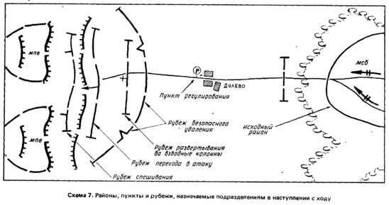 Для организованного выдвижения, развертывания и одновременного перехода в атаку подразделениям назначаются маршрут выдвижения, исходный рубеж (пункт), рубеж (пункт) развертывания в ротные (взводные) колонны, рубеж перехода в атаку и рубеж безопасного удаления, а при атаке в пешем порядке для мотострелкового батальона (роты), кроме того, и рубеж спешивания.