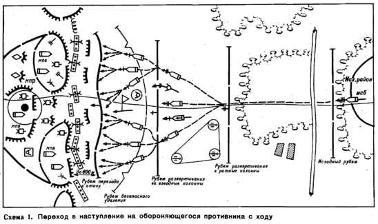 Наступление на обороняющегося противника с ходу осуществляется из исходного района. Выдвигаясь из исходного района, войска последовательно, по мере приближения к противнику развертываются в батальонные, ротные, взводные колонны и в боевую линию.