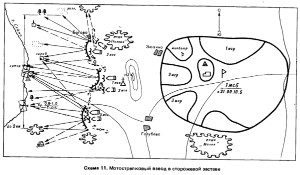 Подразделения роты при расположении на месте охраняются непосредственным охранением – патрульными и дежурными наблюдателями на КНП подразделений. В батальоне организуется сторожевое охранение – сторожевыми постами в составе отделения (танка) (удаление до 1500 м) и секретами в составе двух-трех человек (удаление до 400 м).