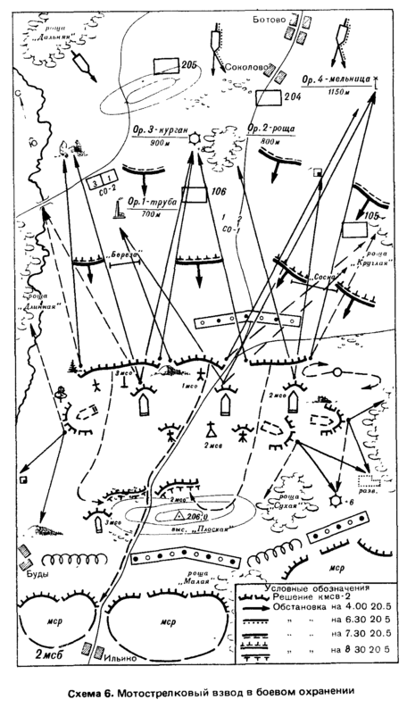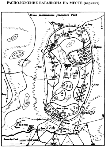 Подразделения технического обеспечения и тыла размещаются в районе расположения батальона с учетом удобства обеспечения подразделений. Но при этом не демаскируют их и своего местоположения. На случай отражения нападения наземного противника мотострелковым (танковым) взводам (ротам) и противотанковому взводу указываются рубежи развертывания и задачи: минометной батареи, гранатометному взводу и приданному артиллерийскому подразделению – огневые позиции, а также порядок подготовки рубежей развертывания (огневых позиций) и выхода на них, возможный маневр огнем и подразделениями.