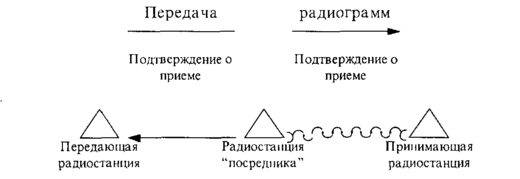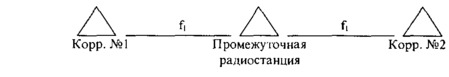 Промежуточные пункты могут производить переприем или ретрансляцию передачи. Для переприема на таком пункте достаточно иметь одну радиостанцию, которая принимает радиограмму от одного корреспондента и затем передает ее другому. Работа всех трех радиостанций при этом ведется на одной частоте (Рис. 17).