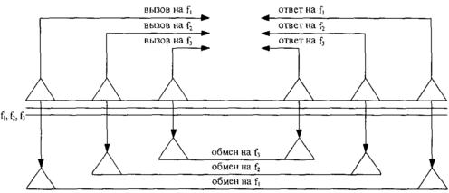 Для работы абонентской радиосети назначается группа частот, одинаково доступных любому корреспонденту этой сети. С целью обеспечения связи между двумя радиостанциями сети вызывающий корреспондент вызов производит на одной из свободных частот указанной группы. Специальное устройство вызываемого корреспондента контролирует все назначенные для связи в абонентской радиосети частоты и при получении вызова на одной из них перестраивает свой приемопередатчик на данную частоту. Связь между двумя корреспондентами осуществляется на этой же частоте в радионаправлении (Рис. 15).