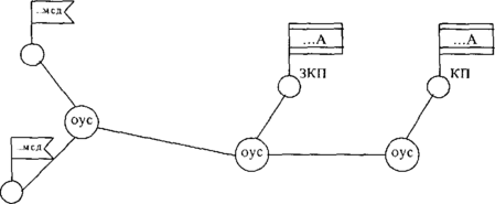 Ось радиорелейной связи – это способ организации радиорелейной связи, при котором связь старшего пункта управления (командира, штаба) с несколькими подчиненными пунктами управления (командирами, штабами) осуществляется по одной радиорелейной линии, развернутой в направлении перемещения своего пункта управления или одного из пунктов управления подчиненных штабов (Рис. 23).