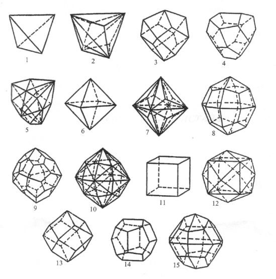 1–тетраэдр; 2–тригонтритетраэдр; 3–тетрагонтритетраэдр; 4–пентагонтритетраэдр; 5–гексатетраэдр; 6–октаэдр; 7–тригонтриоктаэдр; 8–тетрагонтриоктаэдр; 9–пентагонтриоктаэдр; 10–гексагонтриоктаэдр; 11–гексаэдр; 12–тригонтетрагексаэдр; 13–ромбододекаэдр; 14–пентагондодека- эдр; 15–дидодекаэдр
