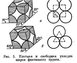 Из рис. 5 можно видеть, что каждый элемент фиктивного грунта, сложенный восемью шарообразными частицами, может иметь плотную (рис. 5, б) и свободную (рис. 5, а) укладку. При этом угол, α ромба, образованного линиями, соединяющими центры шаров, изменяется от 60 до 90°.