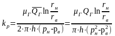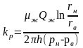 где Qж — расход жидкости или газа (при атмосферном давлении) в мэ/сек; QГ, QГрасход газа при атмосферном и среднем давлении в образце в м3/сек; μж и μг — вязкость жидкости и газа в н·сек/м2; рн и рв — давление у наружной и внутренней поверхностей кольцевого образца в н/м2; rн и rв — наружный и внутренний радиусы кольца в м; hвысота цилиндра в м; kр — проницаемость в м2.