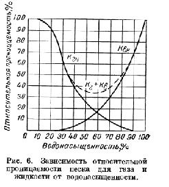 Зависимость относительной проницаемости песка для газа и жидкости от водонасыщенности (двухфазный поток) аналогична и для относительной проницаемости при движении нефти и воды (рис. 6).