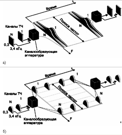 Рис. 2. Принципы разделения (уплотнения) каналов связи: а) схема частотного разделения каналов; б) схема временного разделения каналов