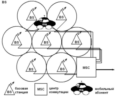 Принцип работы сотовых систем радиосвязи основан на взаимодействии мобильных станций с фиксированной ретрансляционной сетью, объединенной с центром коммутации скоростными линиями связи. Для реализации этого принципа в состав сетей подвижной связи входят: