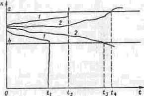 В эксплуатационных условиях изменение выходного параметра системы представляет случайную функцию. Если выход параметра k за границу допуска является опасным, то графически переход из исправного состояния прибора в неисправное, можно изобразить как пересечение случайной функцией одной из границ допуска а и или b (рис. 4.1).