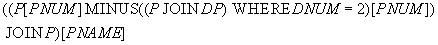- соединить список номеров поставщиков, не поставляющих деталь номер 2 с данными о поставщиках (получатся полные данные о поставщиках, не поставляющих деталь номер 2).