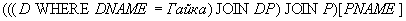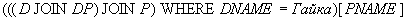 Пример 13. Получить имена поставщиков, поставляющих по крайней мере одну гайку.