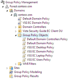 4. Разверните узел Group Policy Objects (Объекты групповой политики) и убедитесь в том, что четыре созданных объекта групповой политики VSG EC соответствуют объектам на следующем рисунке.