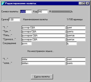 Этот каталог содержит список валют, с которыми Вы можете работать. Национальную денежную единицу в этот каталог заносить не надо. Создайте 2 валюты – доллар США и немецкую марку согласно заданию 7. Задав доллар, нажмите F7 для ввода немецкой марки. Этот каталог содержит список валют, с которыми Вы можете работать. Национальную денежную единицу в этот каталог заносить не надо.